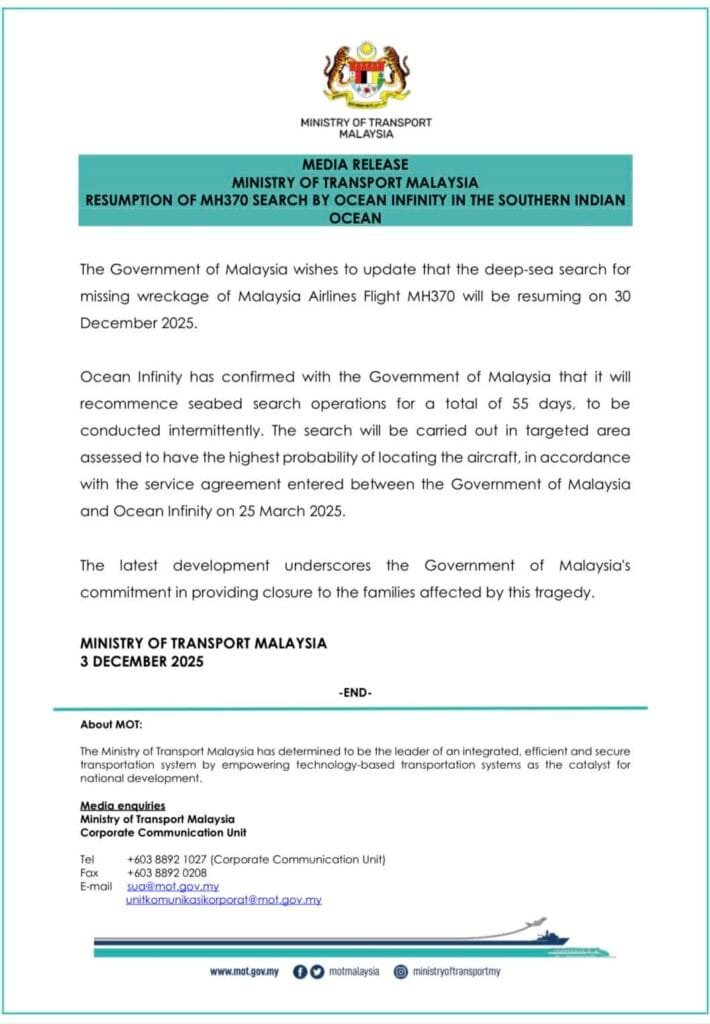 According to the Malaysian Transport Ministry, the US-based marine robotics firm Ocean Infinity has officially given its green light to restart its deep-sea search beginning December 30, an operation expected to run for 55 days.