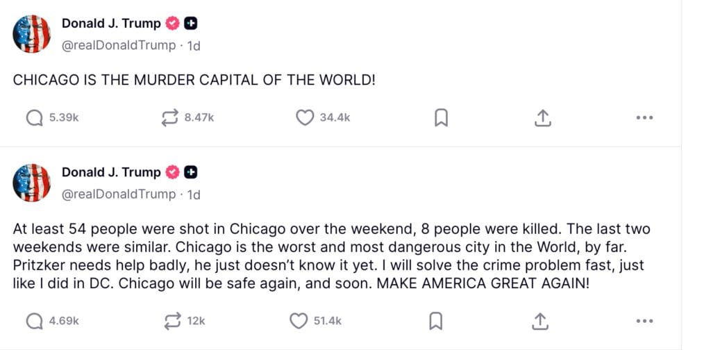 Posting on his Truth Social platform on Tuesday, Trump described Chicago in the state of Illinois as “the murder capital of the world” and pointed to rising crime figures.